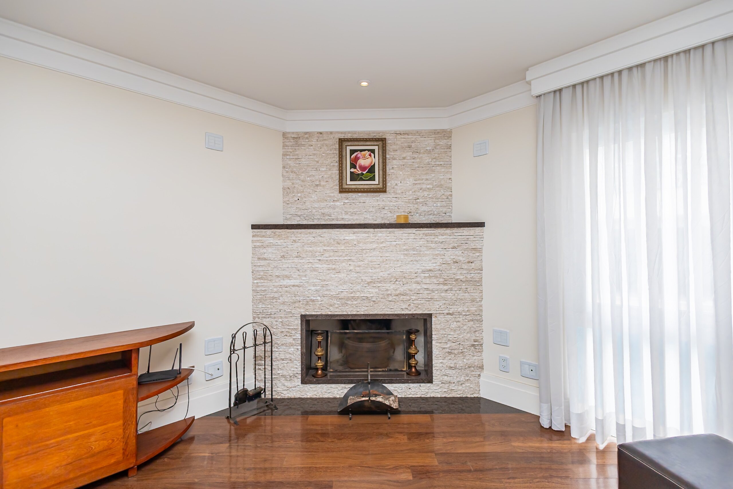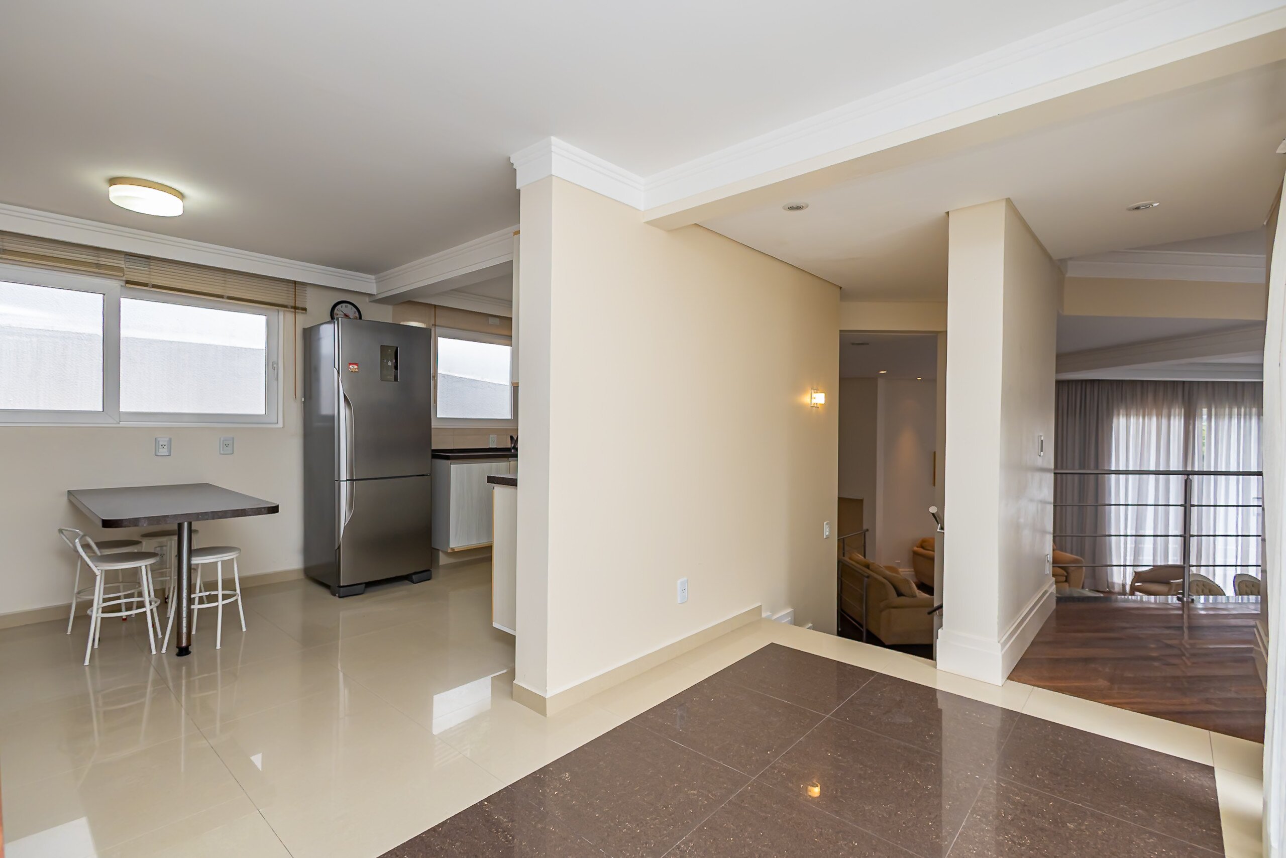 Sala ampla com lareira e integração com área gourmet