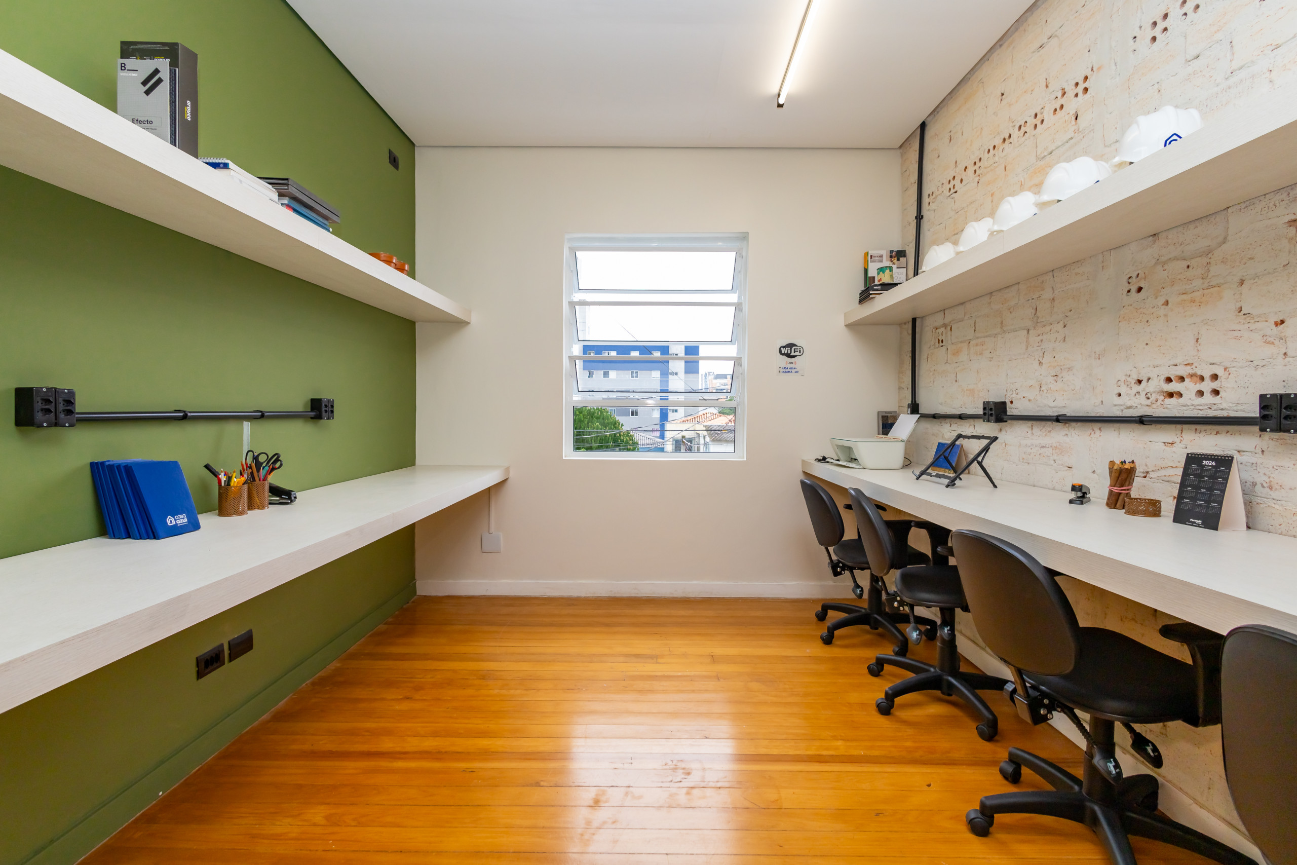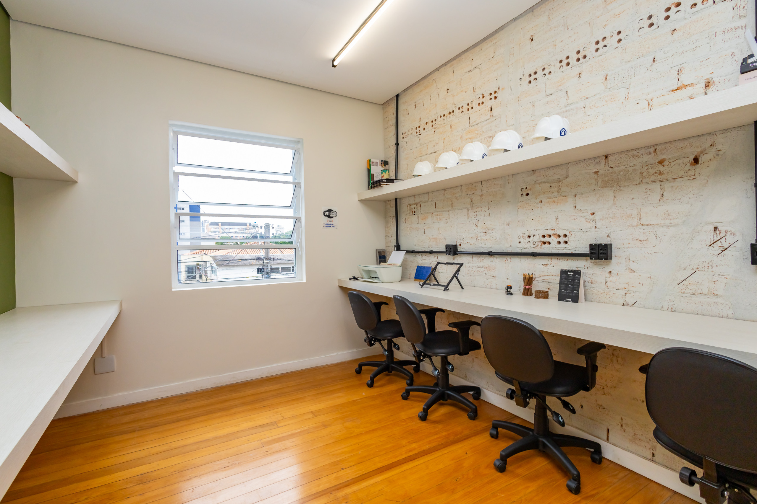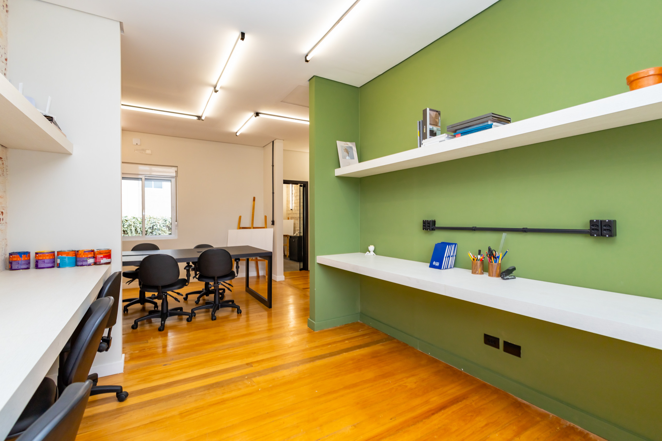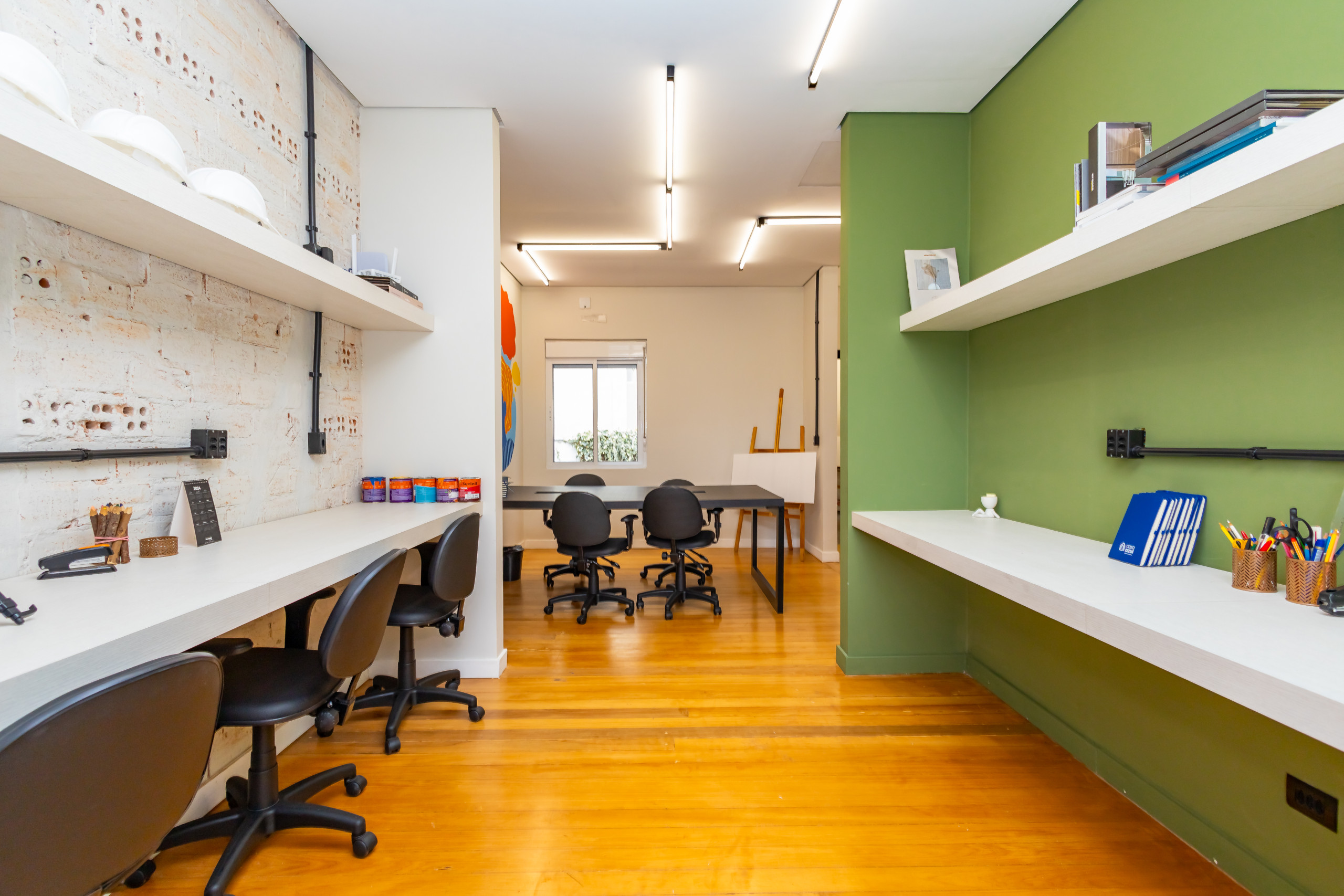 São duas salas integradas, mobiliadas para uso de escritório, com 3 bancadas grandes, armários, prateleiras e cadeiras ergonômicas de acordo com a NBR. São 14 estações de trabalho de integrado, estilo coworking. Tem também uma sala de reunião separada, com tv, com mesa para 4 pessoas e armários. Ambientes climatizados, frigobar, filtro de água gelada e cafeteira de cápsula. Banheiro unissex e acesso por escada. Tudo reformado, novo sem uso e internet incluso.