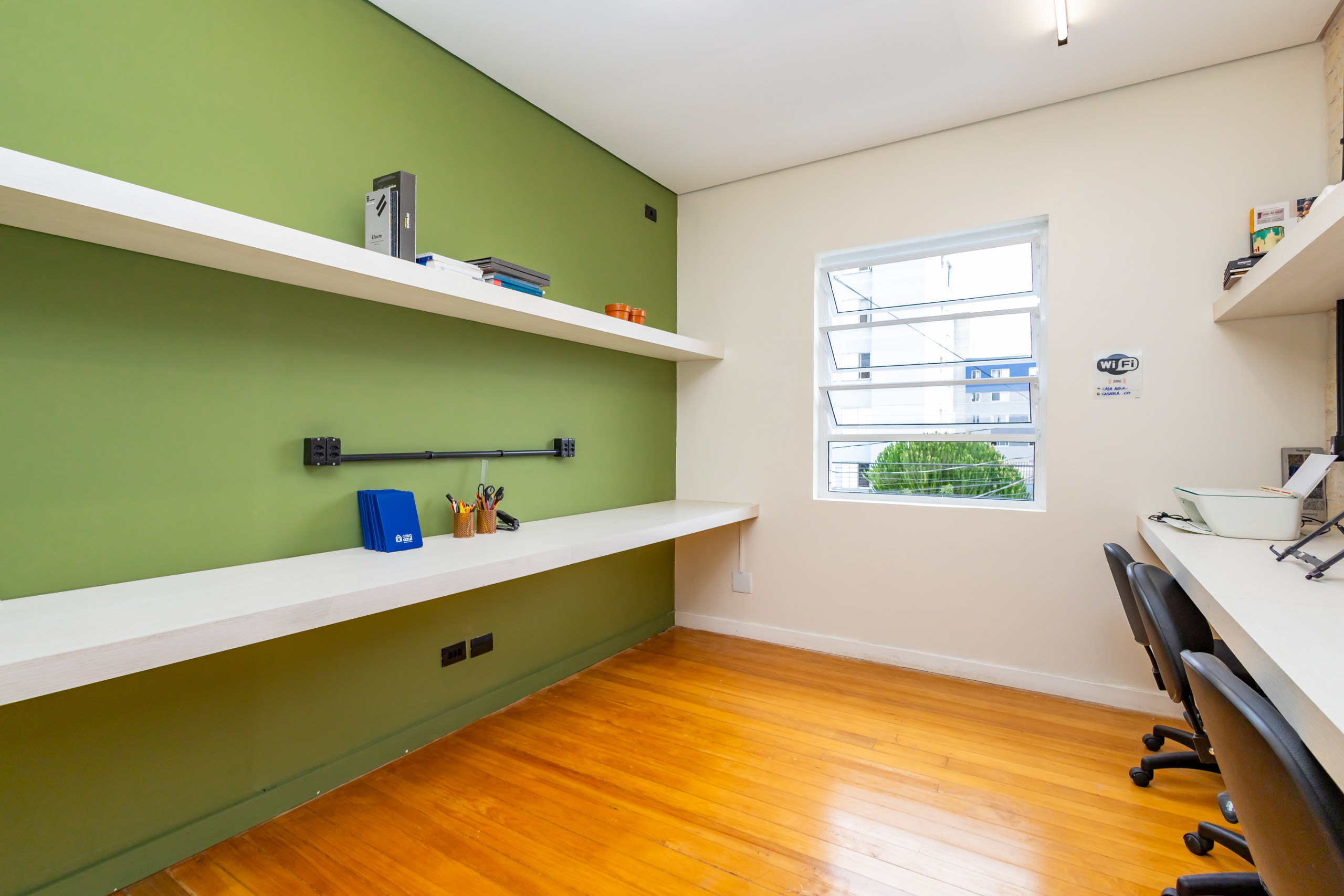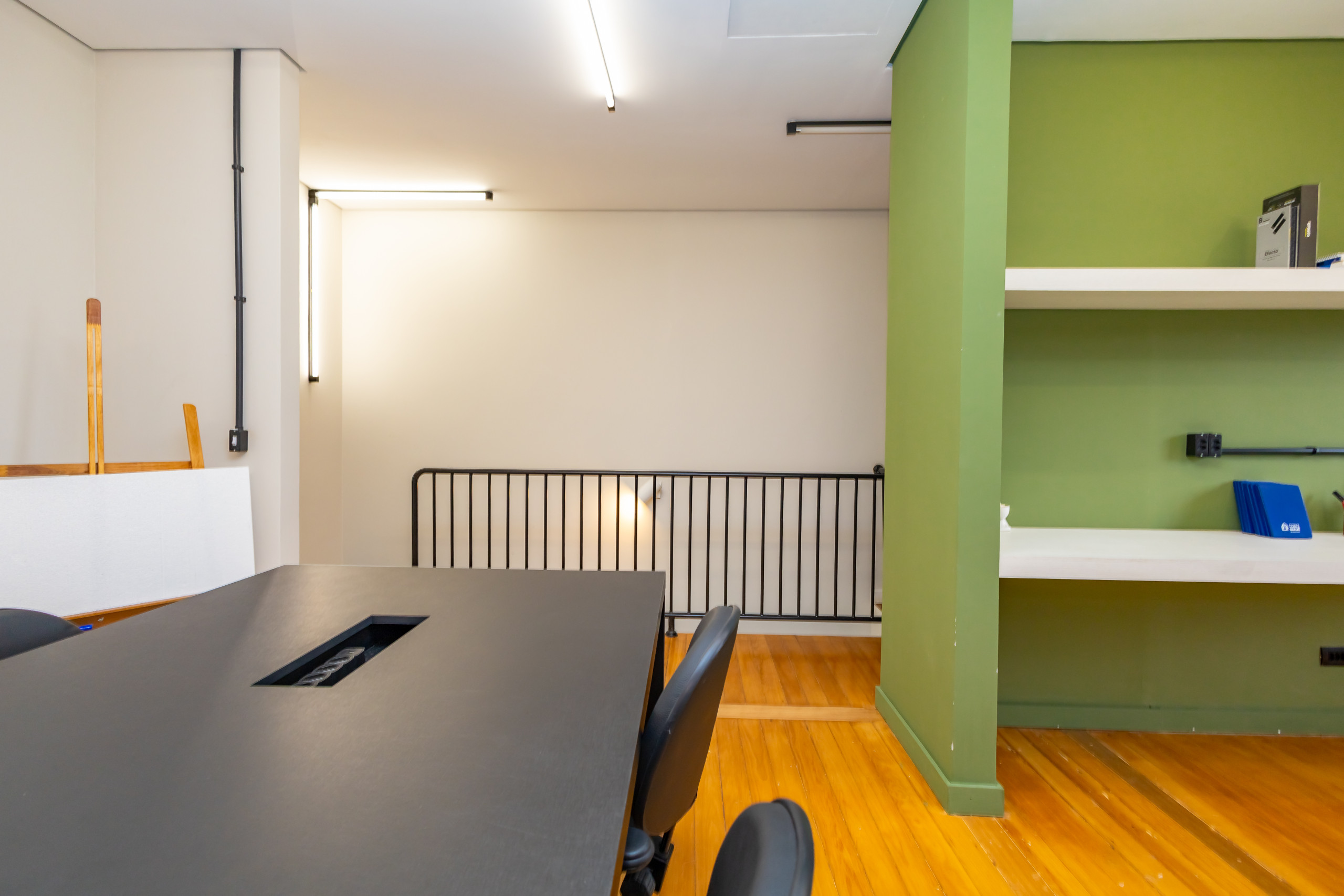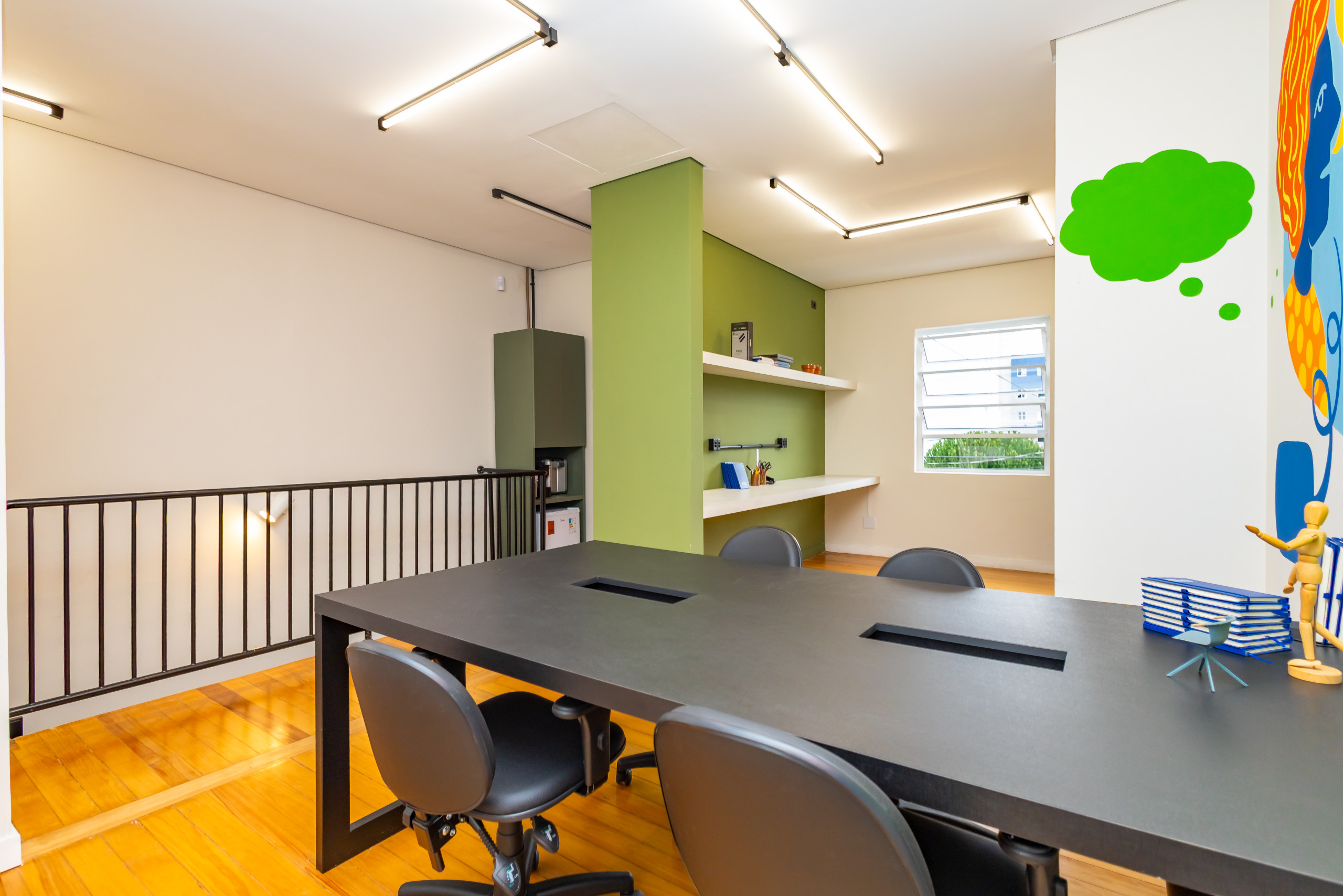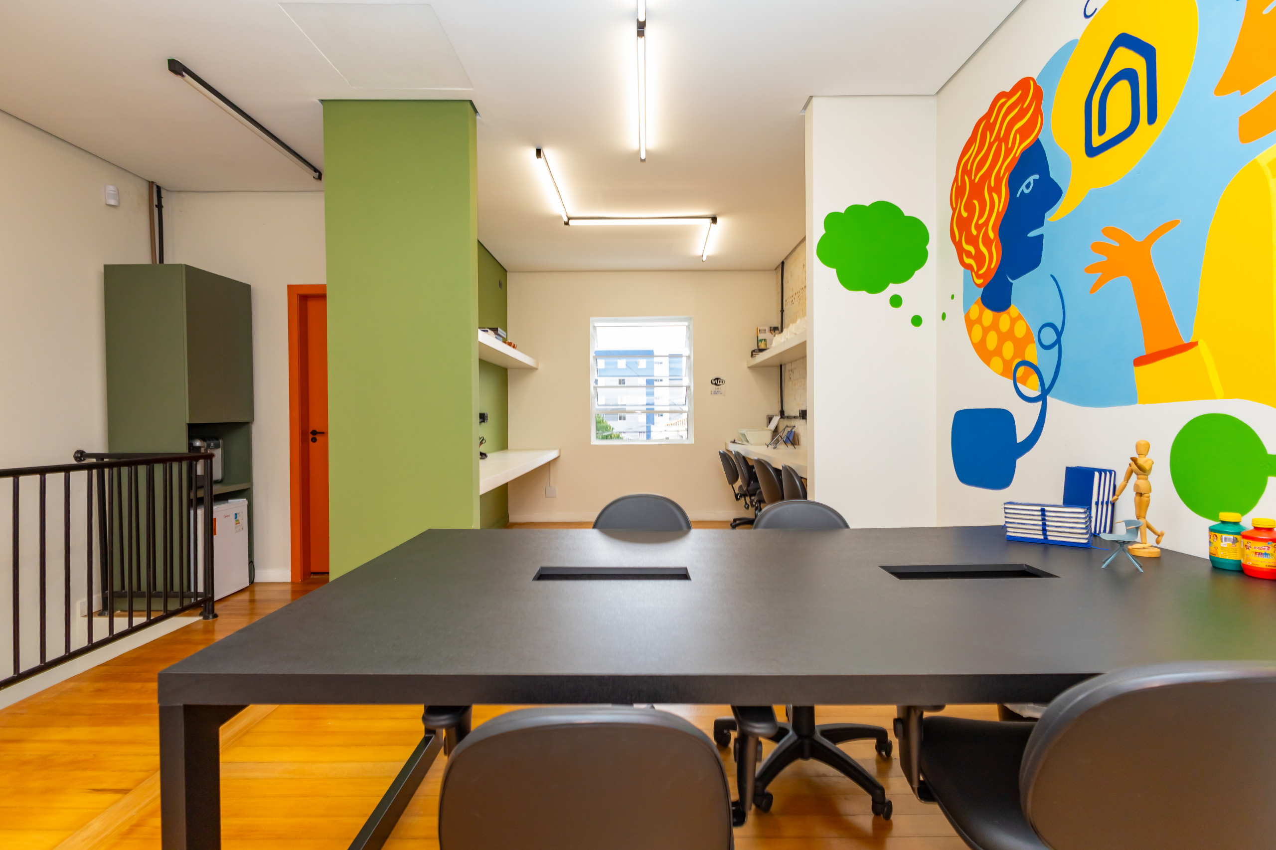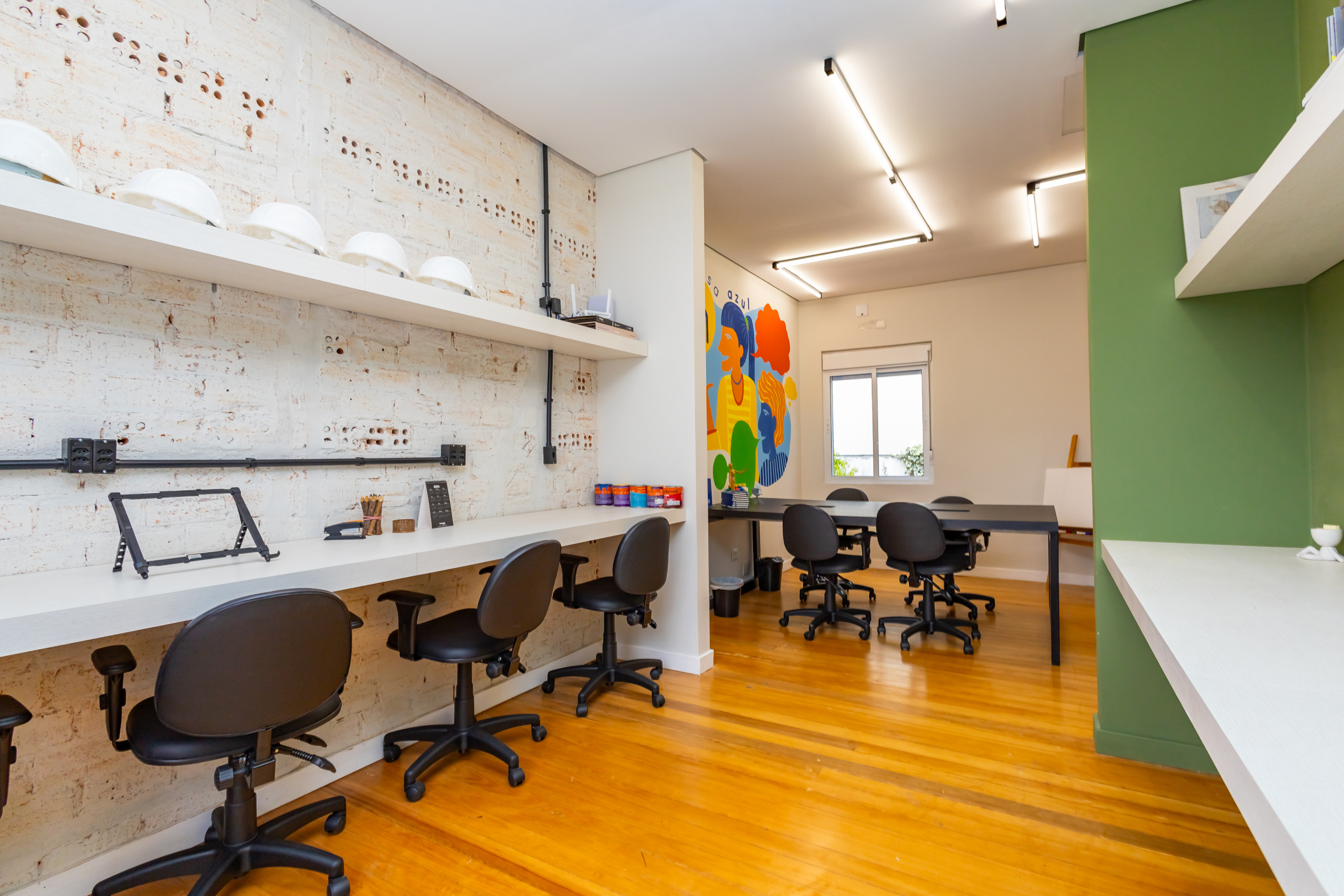 São duas salas integradas, mobiliadas para uso de escritório, com 3 bancadas grandes, armários, prateleiras e cadeiras ergonômicas de acordo com a NBR. São 14 estações de trabalho de integrado, estilo coworking. Tem também uma sala de reunião separada, com tv, com mesa para 4 pessoas e armários. Ambientes climatizados, frigobar, filtro de água gelada e cafeteira de cápsula. Banheiro unissex e acesso por escada. Tudo reformado, novo sem uso e internet incluso.