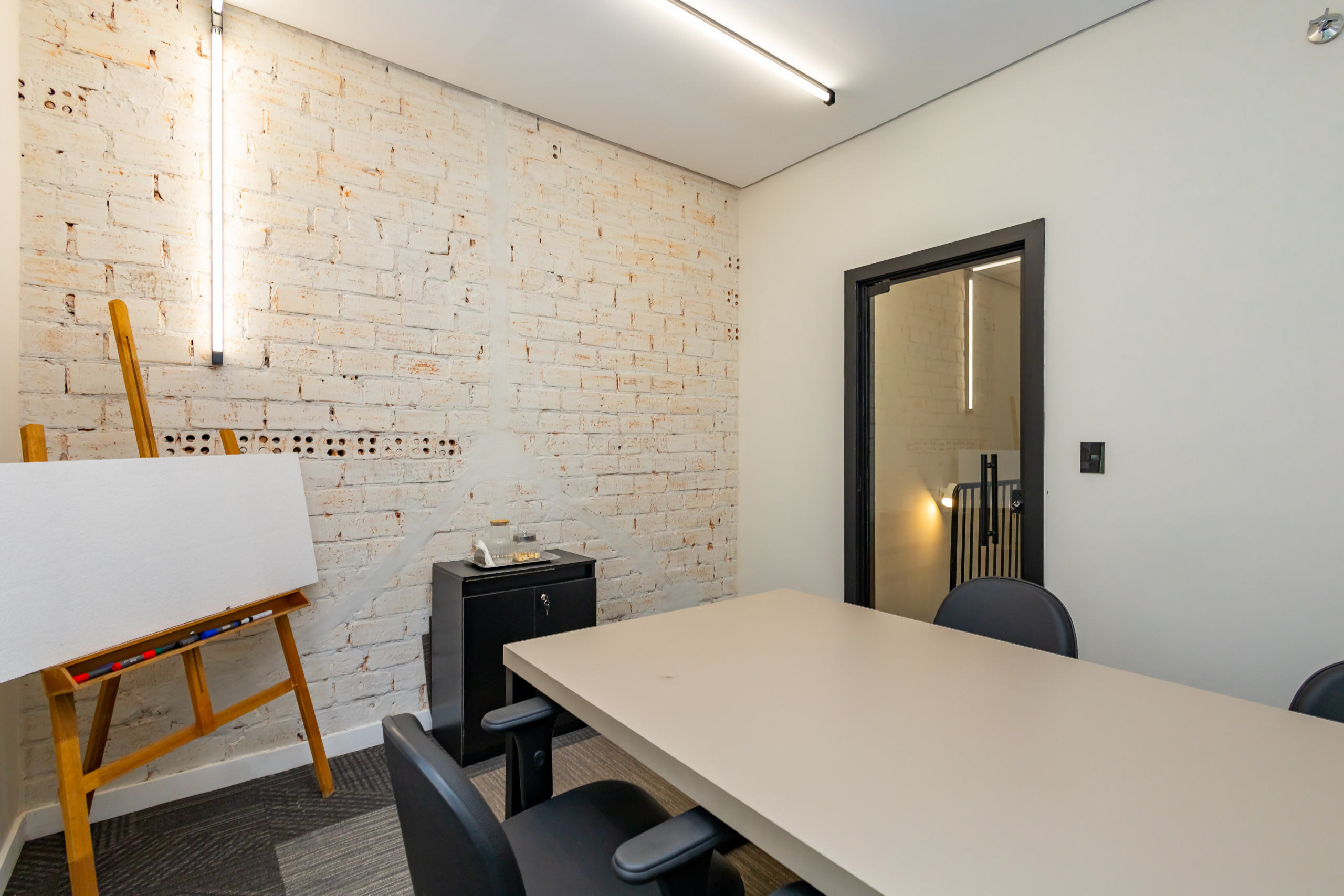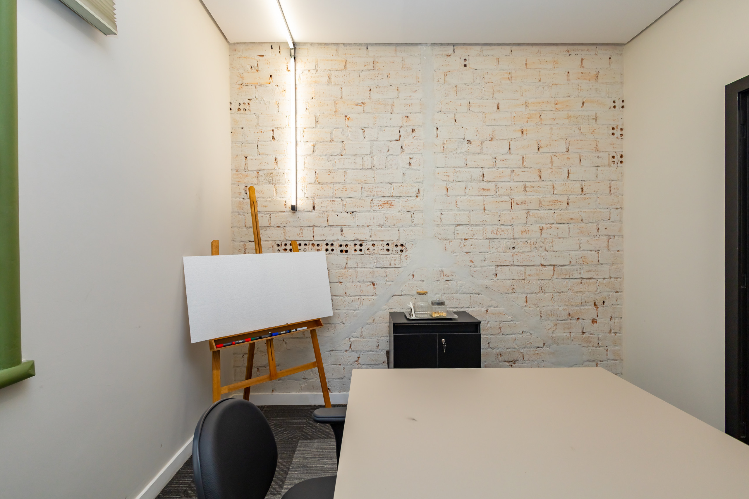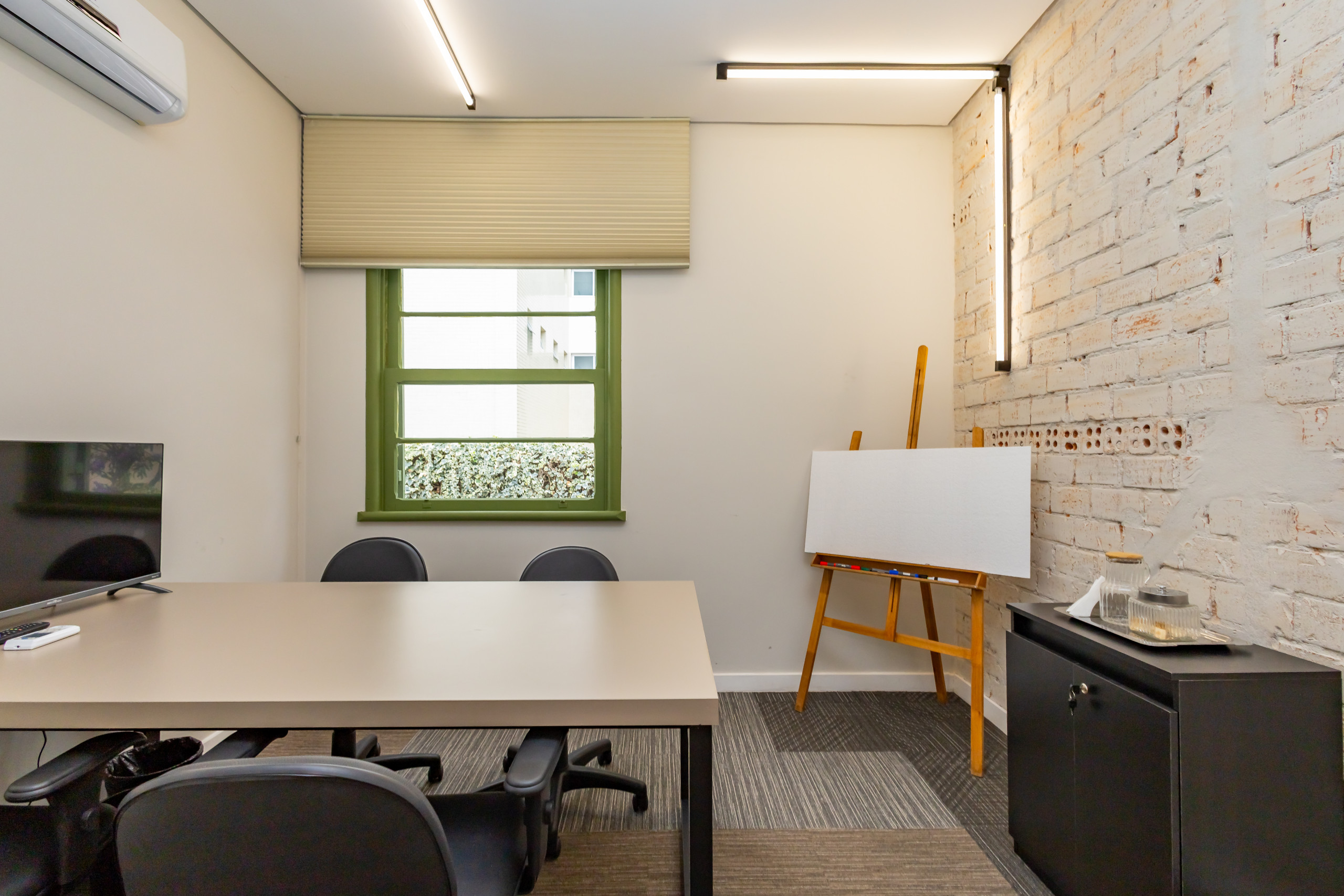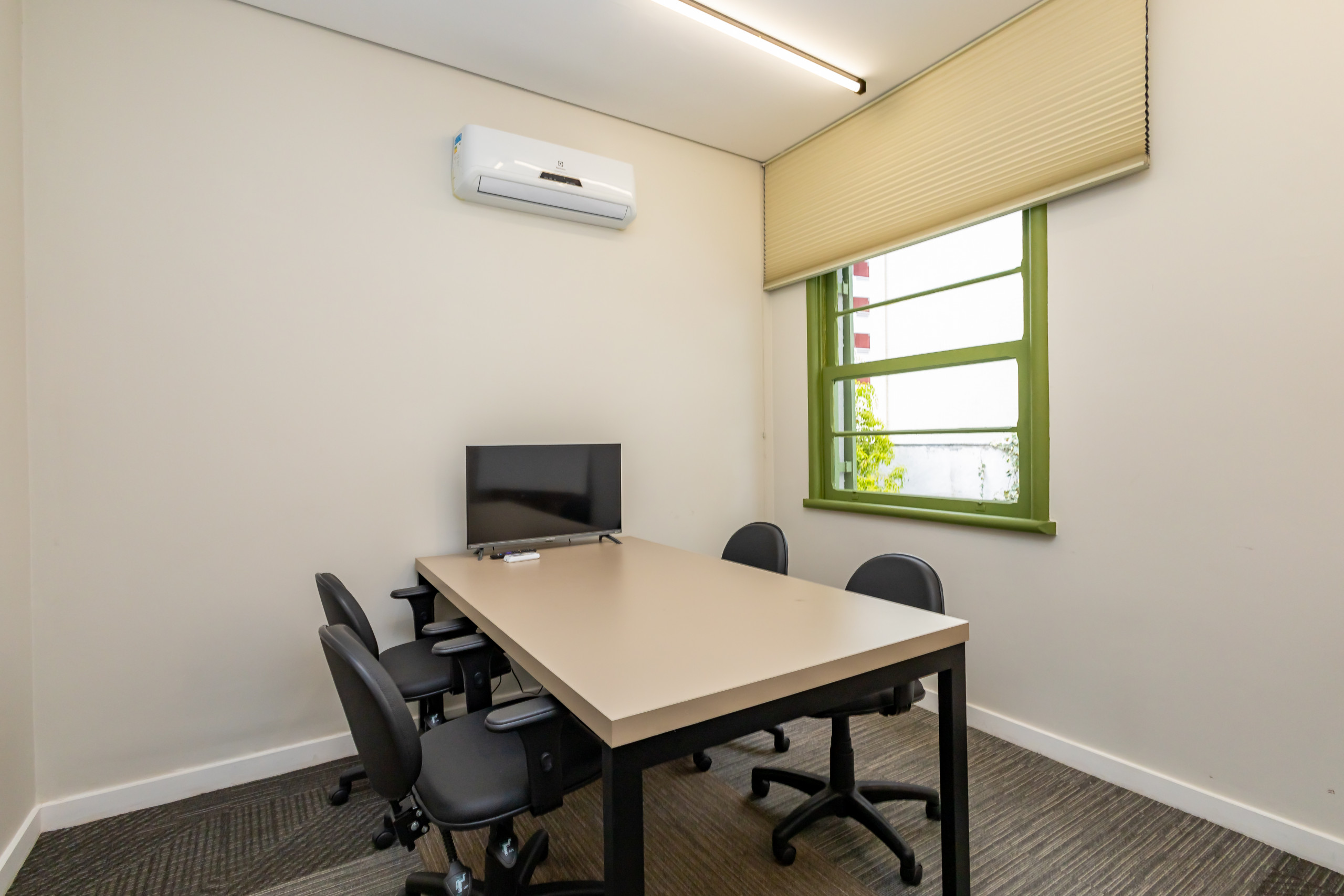 São duas salas integradas, mobiliadas para uso de escritório, com 3 bancadas grandes, armários, prateleiras e cadeiras ergonômicas de acordo com a NBR. São 14 estações de trabalho de integrado, estilo coworking. Tem também uma sala de reunião separada, com tv, com mesa para 4 pessoas e armários. Ambientes climatizados, frigobar, filtro de água gelada e cafeteira de cápsula. Banheiro unissex e acesso por escada. Tudo reformado, novo sem uso e internet incluso.