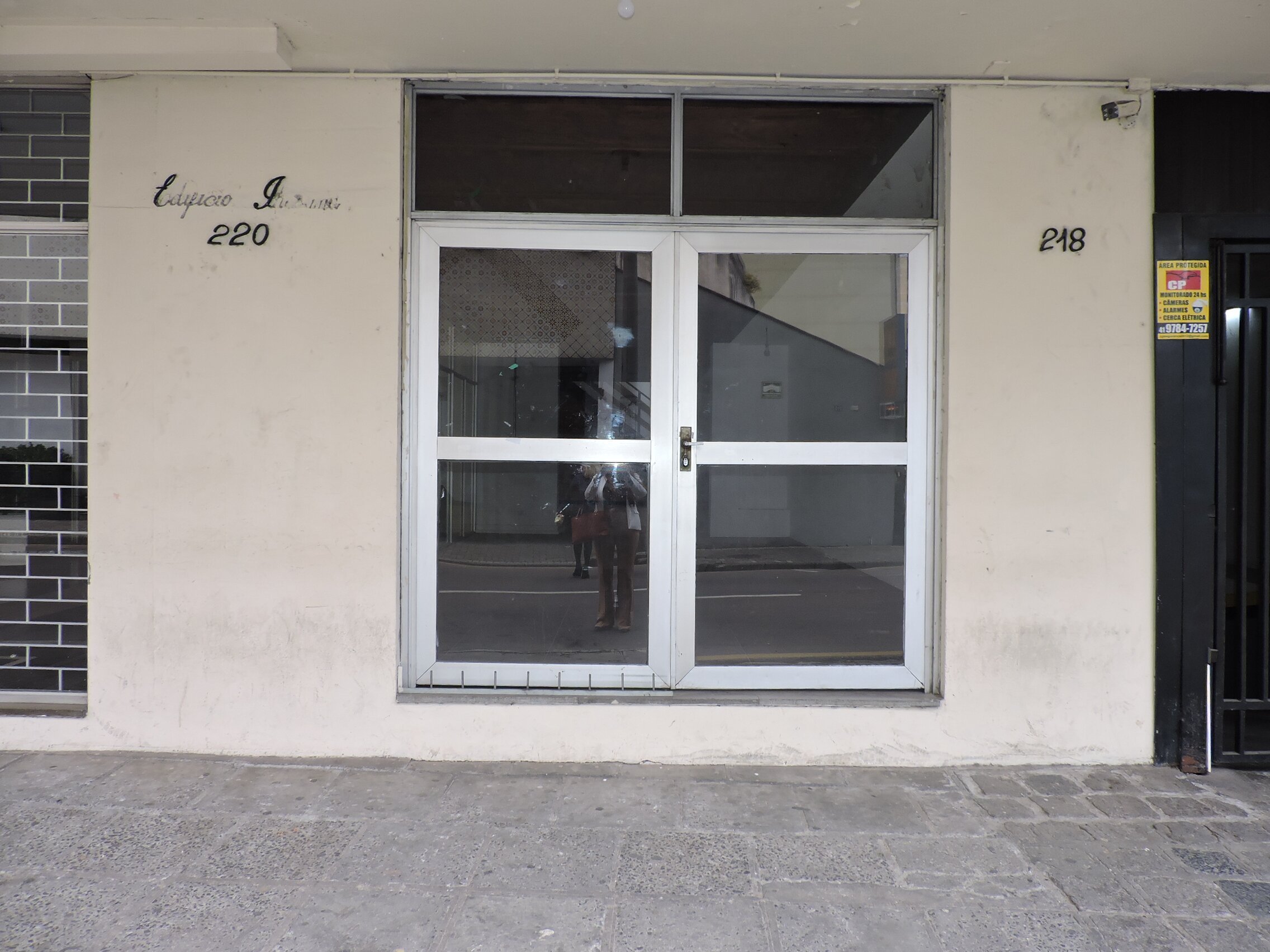 Vitrine voltada para a portaria do condomínio, com porta de vidro voltada para a rua.