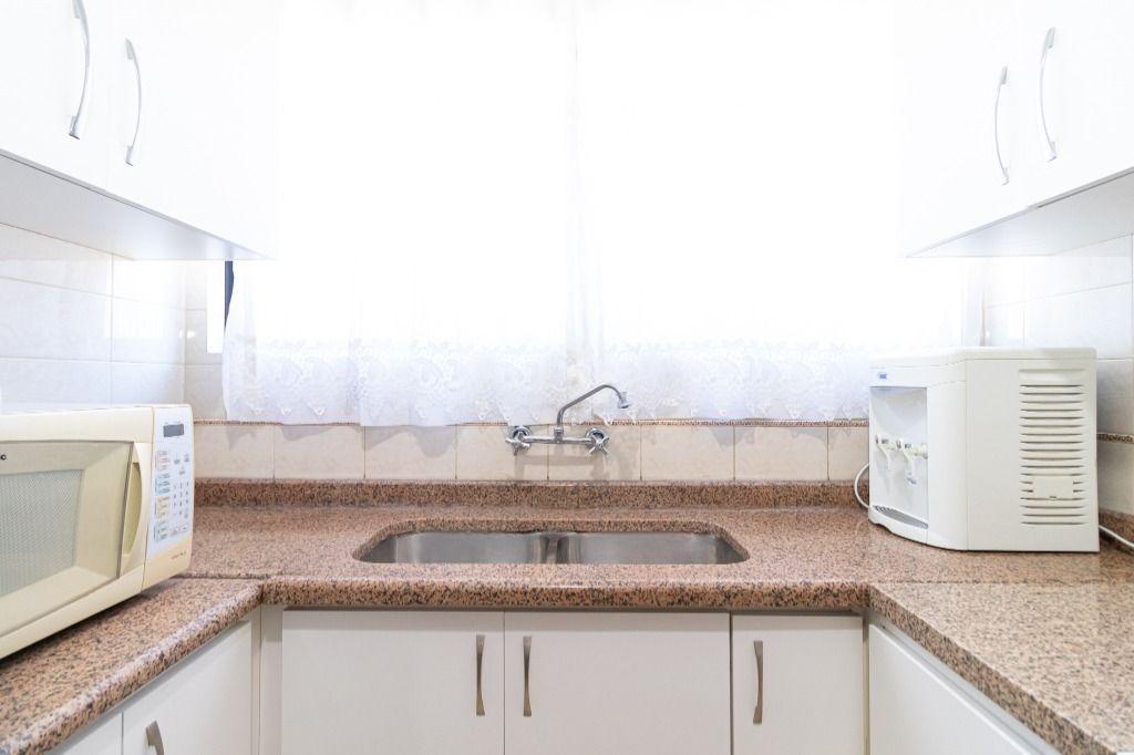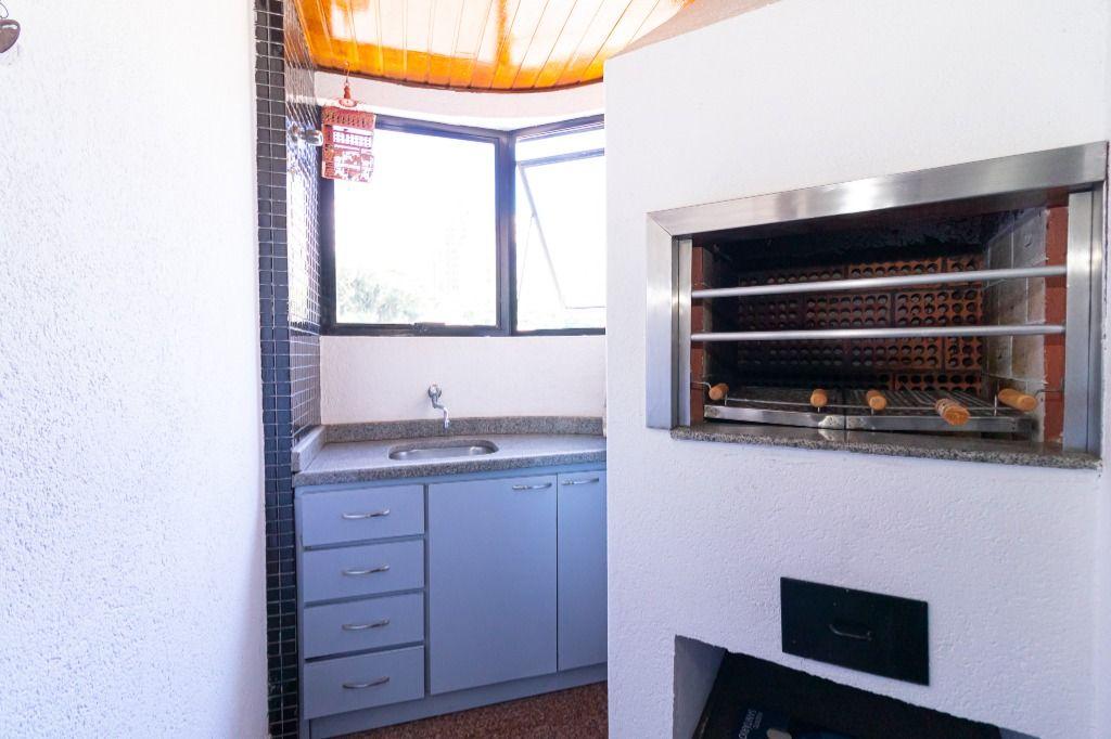 Copa anexa à espaçosa sacada com churrasqueira a carvão, armários e pia ideal para confraternizações;