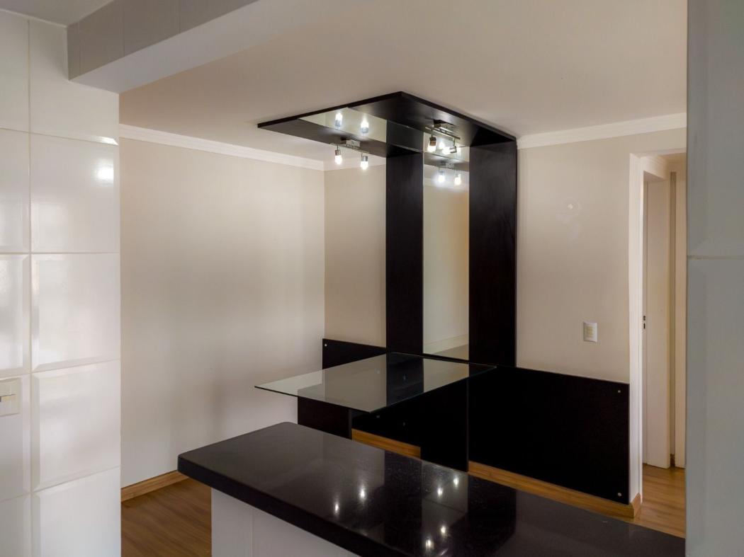 Este apartamento semimobiliado conta com 2 dormitórios com armários embutidos, banheiro social completo com box de vidro, painel com espelho e luminárias, além de balcão com bancada de mármore travertino e pia suspensa. A sala é ampla, ideal para dois ambientes, com espaço para estar e jantar. Aproveite a sacada com vista externa do condomínio e a cozinha americana planejada, equipada com armários sob medida, bancadas em granito preto e fogão embutido. A área de serviço é separada e conta com armários planejados, tanque embutido e bancada de granito.