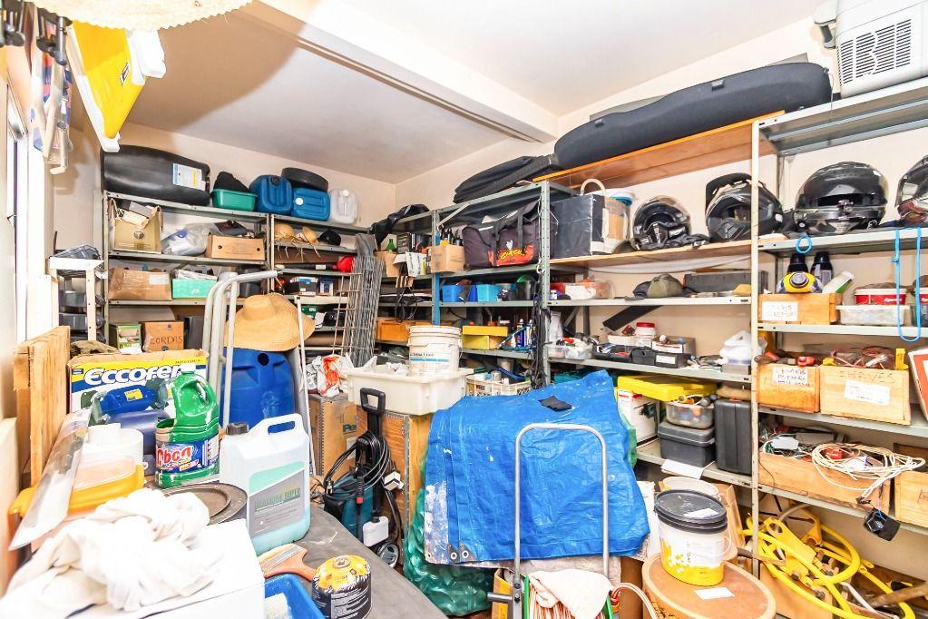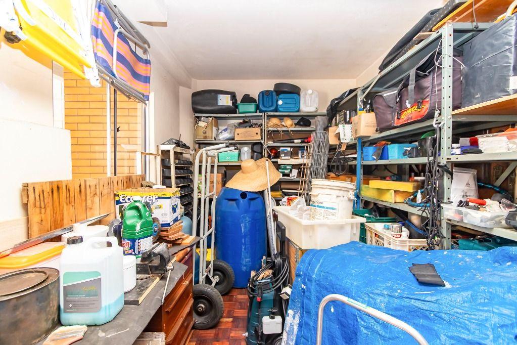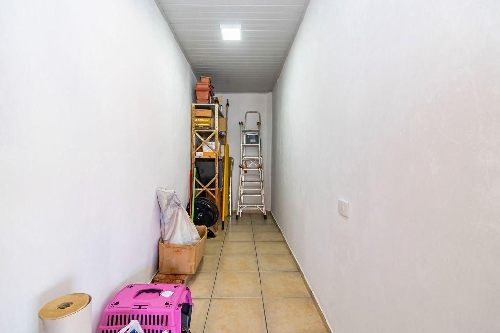 Área lateral para armazenamento de botijões de gás e tambor de captação de água da chuva e ferramentas de limpeza