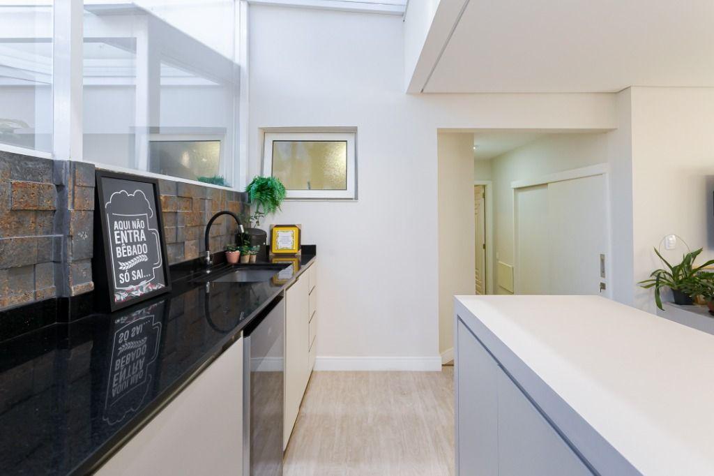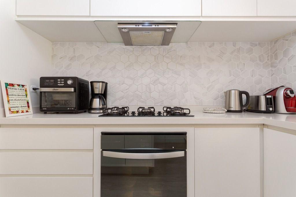 Cozinha planejada, equipada com bancada em granito, forno, cooktop e coifa