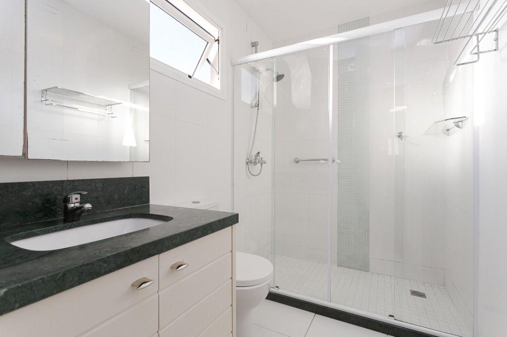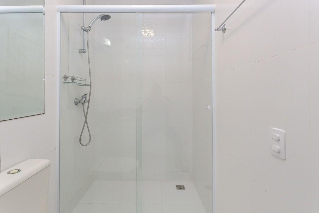 Banheiro social completo, com armário e box