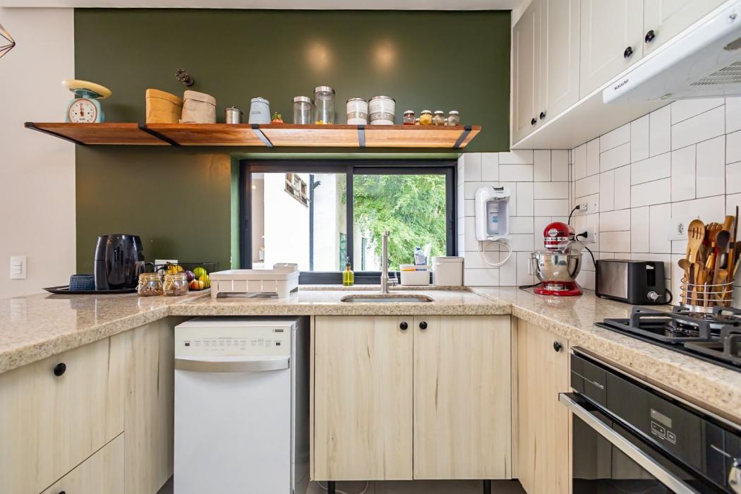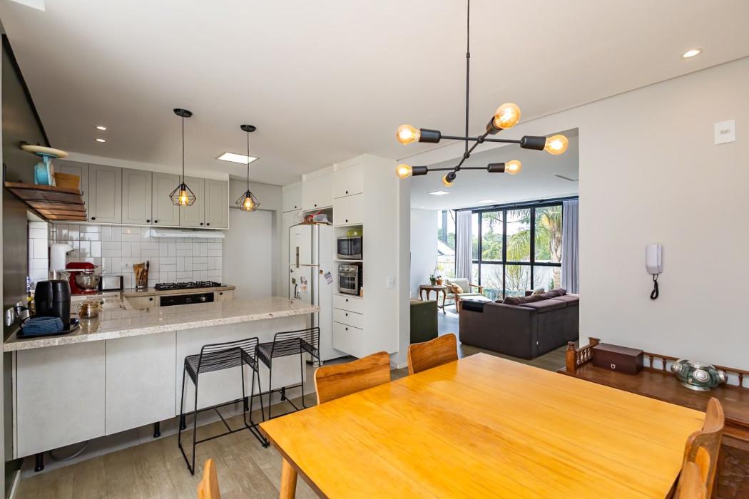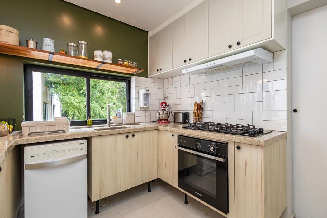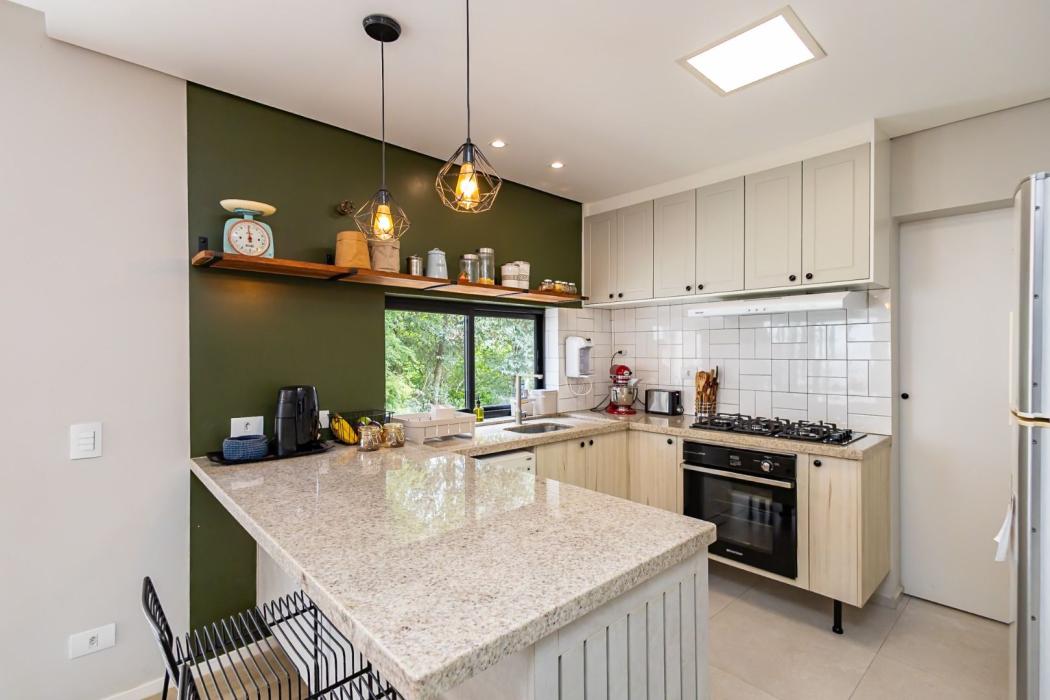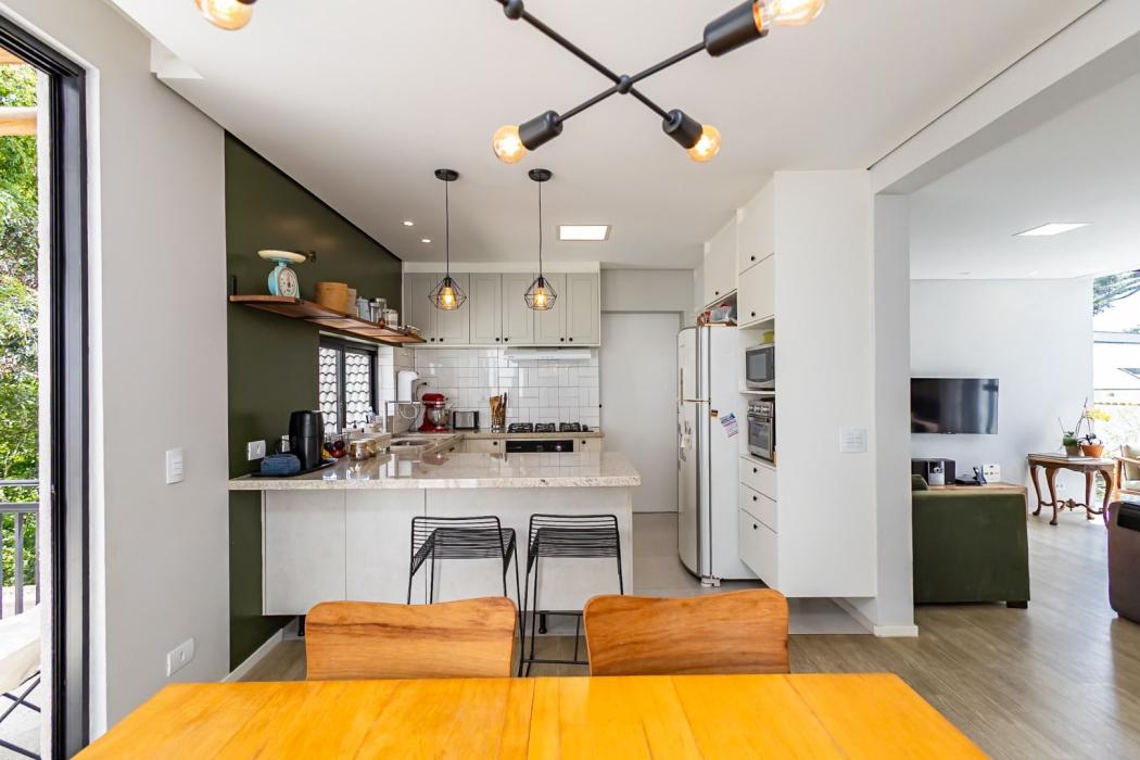 Cozinha planejada com armários sob medida, bancada em granito, cooktop e forno embutido
