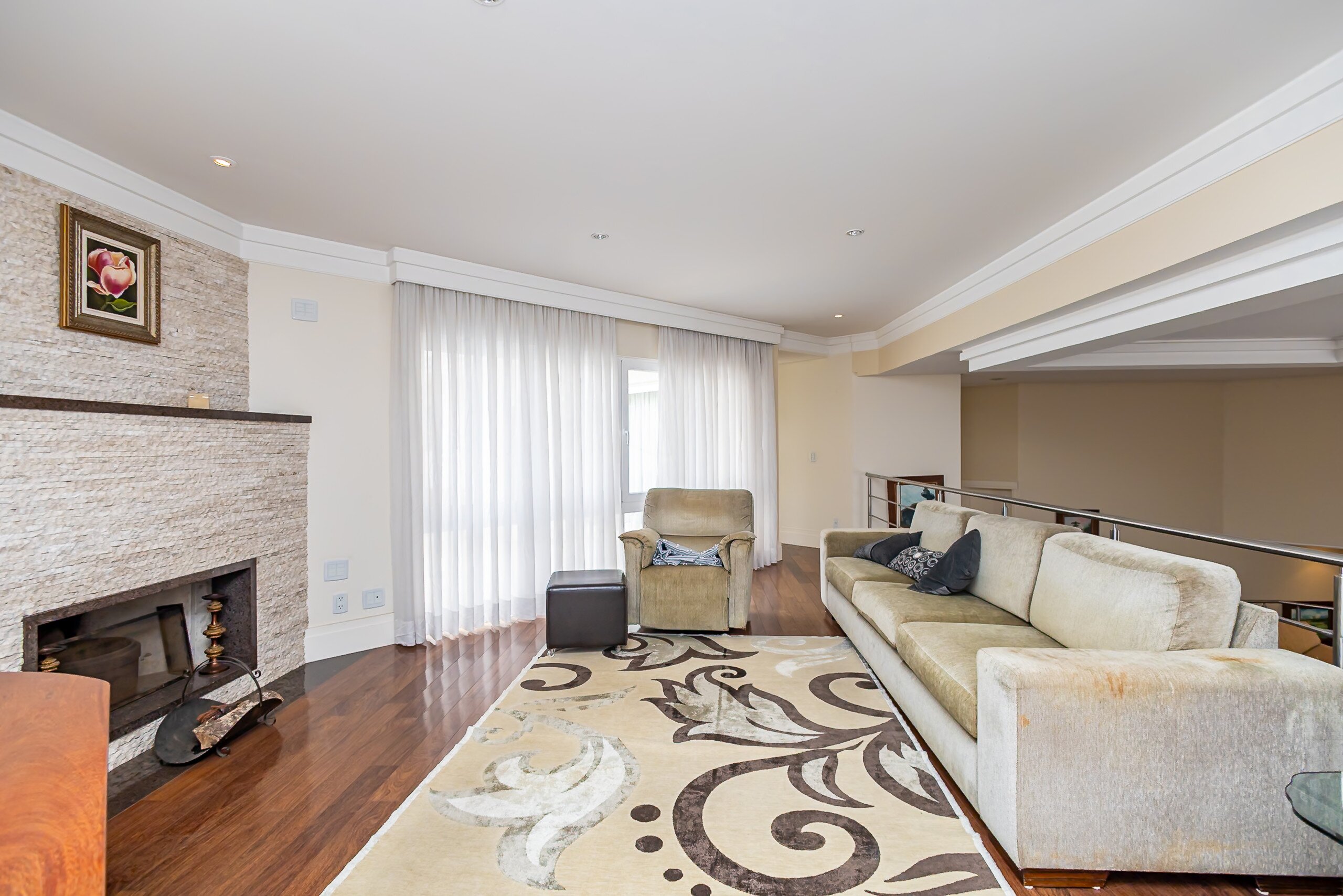 Sala ampla com lareira e integração com área gourmet
