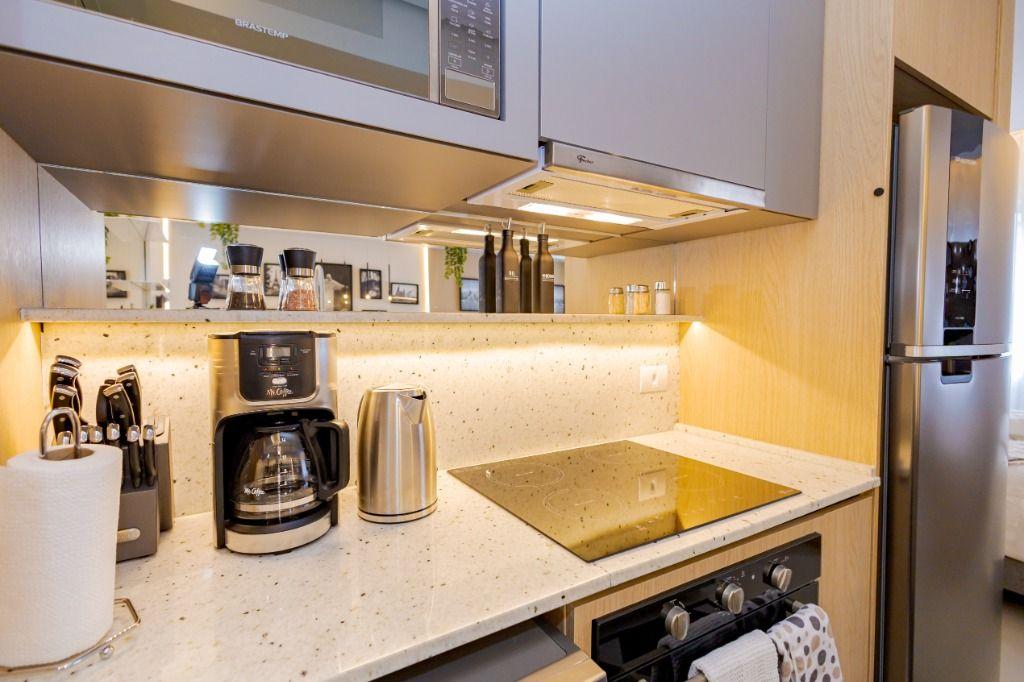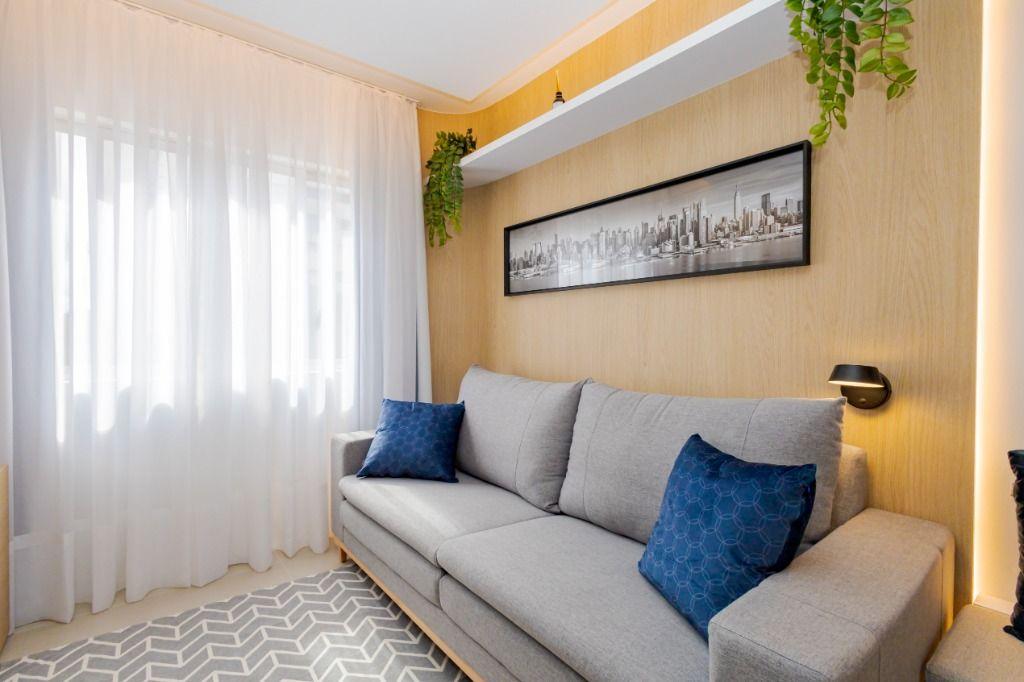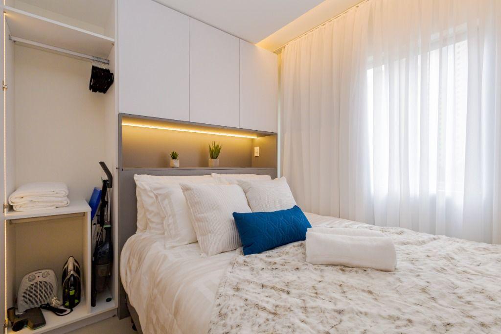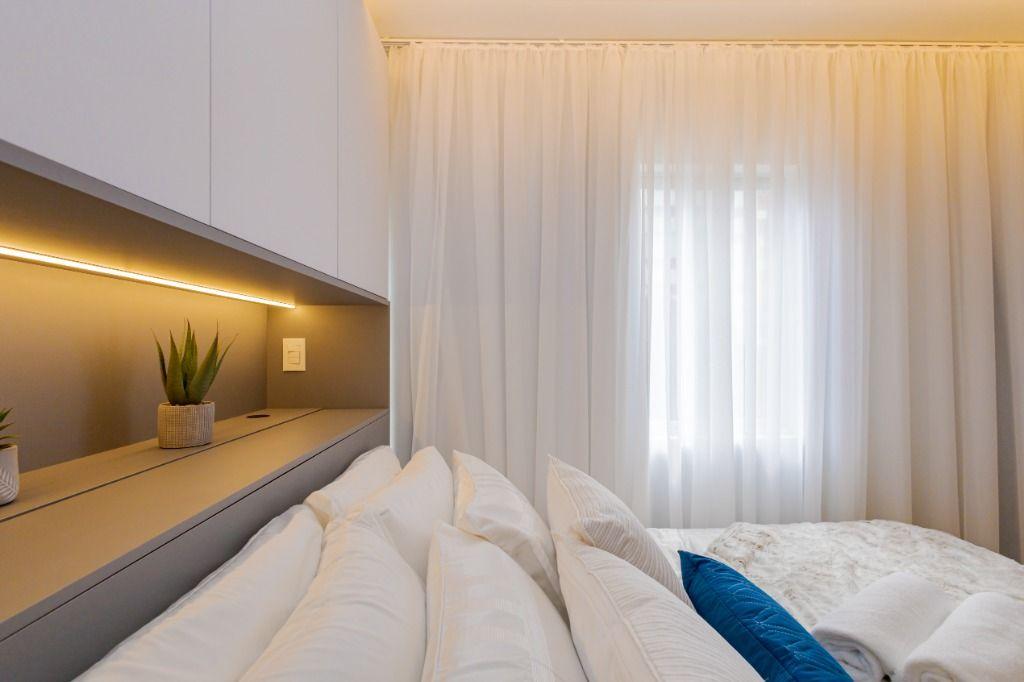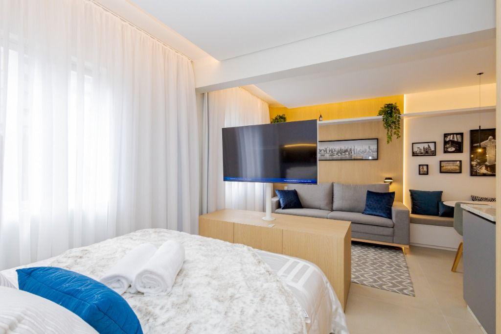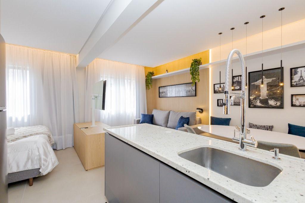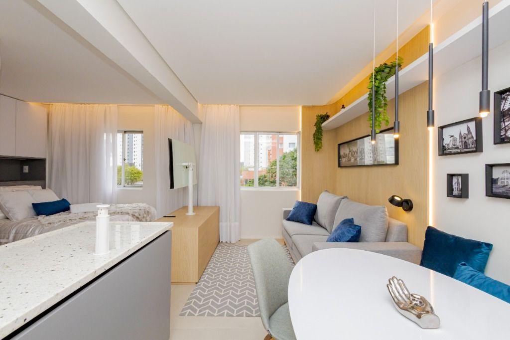 Studio todo reformado com acessórios de qualidade e ótimo gosto. Cozinha planejada com móveis de primeira linha, ficando cooktop, forno e coifa. Sala conjugada com o quarto em teto em gesso e iluminação em led. No banheiro vidro em blindex. O imóvel está localizado em frente a Faculdade Evangélica Mackenzie no Bigorrilho.