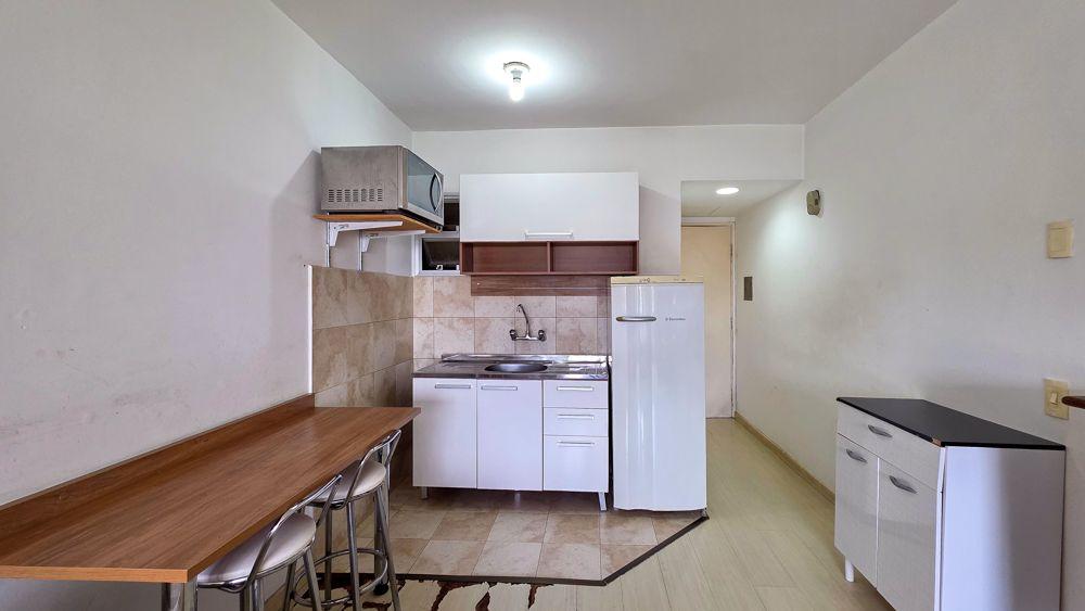 A cozinha com armários e espaço para eletrodomésticos otimiza cada metro do imóvel, enquanto a área de dormitório/estar comporta cama, sofá e armário, criando um ambiente aconchegante para morar ou alugar.