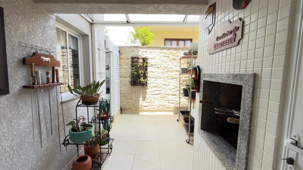 A área social foi desenhada para receber com conforto. O living integra sala, lavabo, cozinha planejada e o espaço de churrasqueira, que dialoga diretamente com a cozinha e com a sala, criando um ambiente acolhedor e funcional. No piso térreo, a lavanderia conta com bancada ampla e cooktop auxiliar, ideal para preparos mais intensos. Há ainda uma vaga de garagem descoberta, com acesso prático.