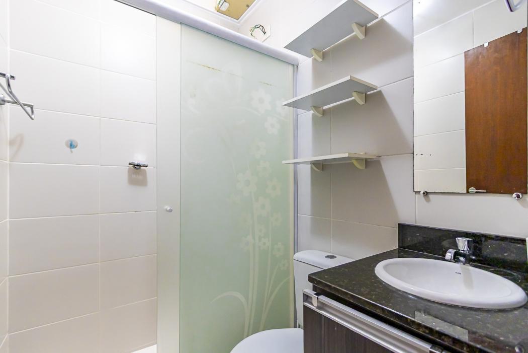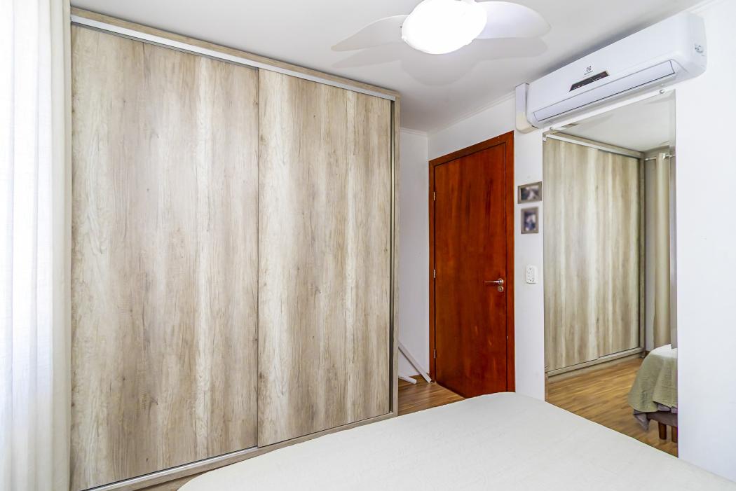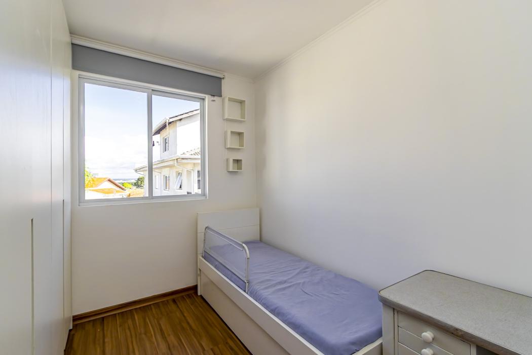 No pavimento superior, o sobrado conta com três dormitórios, sendo uma suíte, além de banheiro social. O hall íntimo entre os quartos permite a criação de um home office, espaço de leitura ou apoio, agregando versatilidade ao projeto.