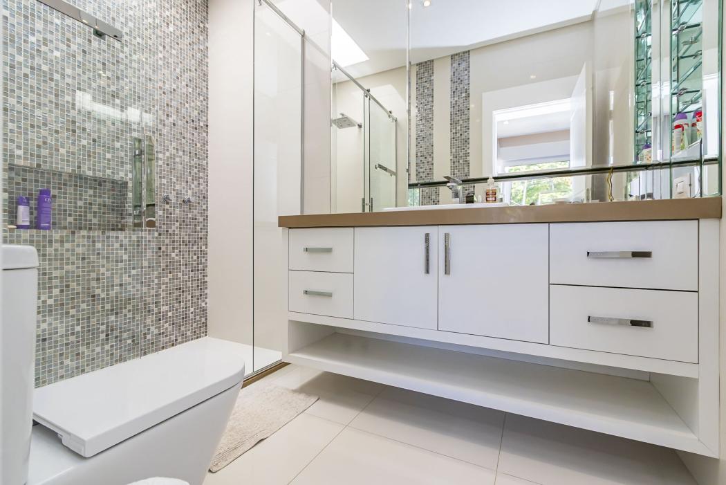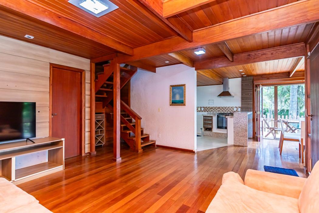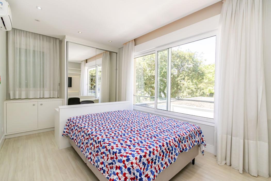 A residência principal conta com 455 m² de arquitetura sólida e atemporal. O living impressiona pelo pé-direito alto e pela integração fluida entre os ambientes sociais, todos voltados para o jardim e a piscina. A luz natural invade os espaços com suavidade, criando uma atmosfera de calma e bem-estar que hoje é um verdadeiro luxo.