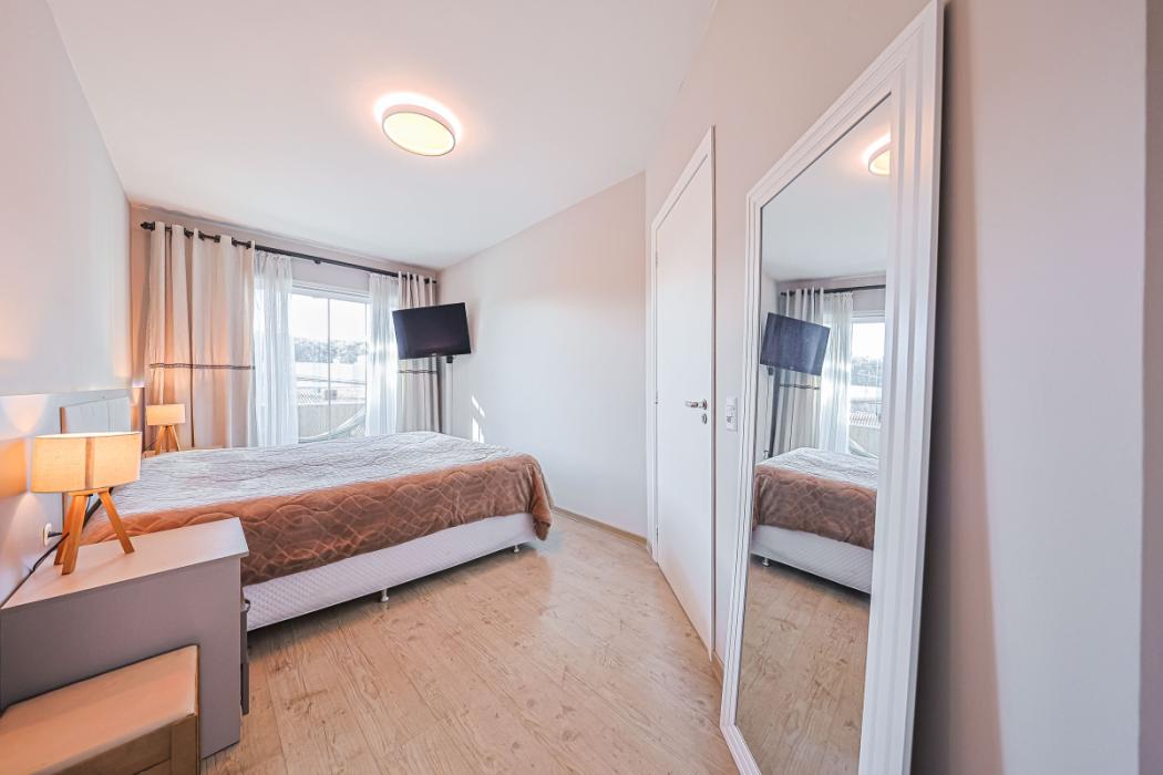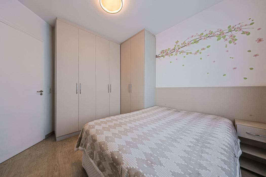 No primeiro piso, medindo 56,08 m², contém 3 quartos sendo um suíte, na suíte há uma sacada fechada com vidro, dois quartos com armários planejados, banheiros com box blindex.