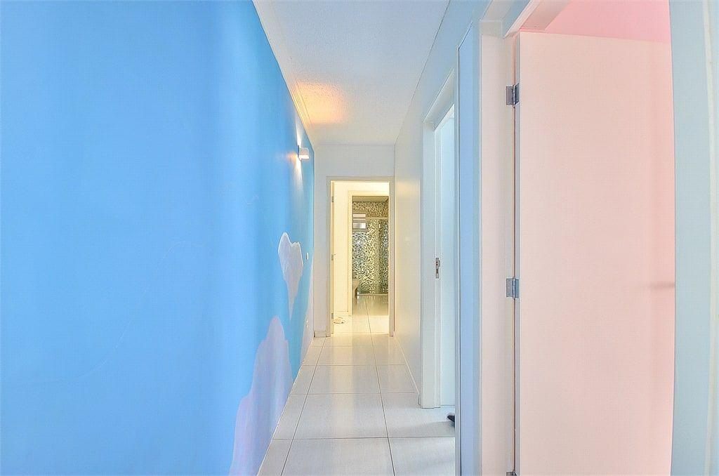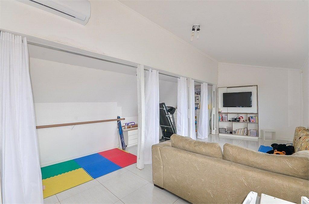 No primeiro andar o imóvel possui 150m² de área construída, churrasqueira, sala e cozinha no conceito aberto, área de serviço/lavanderia, quatro quartos, sendo uma suíte, três quartos possuem closet e atualmente um dos quartos está sendo usado como escritório.